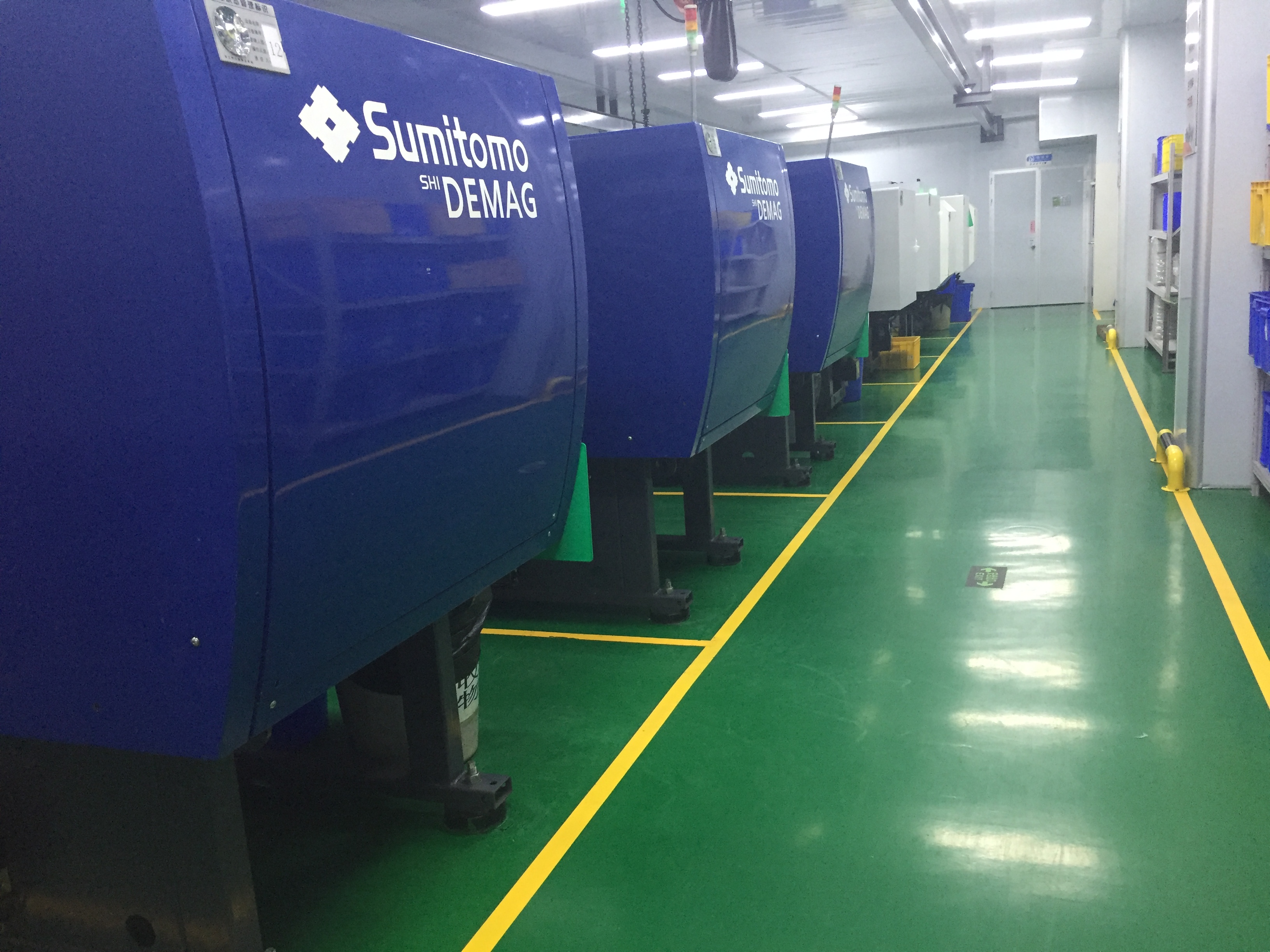 十万级无尘净化车间,住友海天等注塑机台42台,包含80吨(小型产品)到380吨(大型产品)机台,其中180吨以上机台注塑机台有13台,独立的物料通道与人员通道分离,保证车间干净无尘
